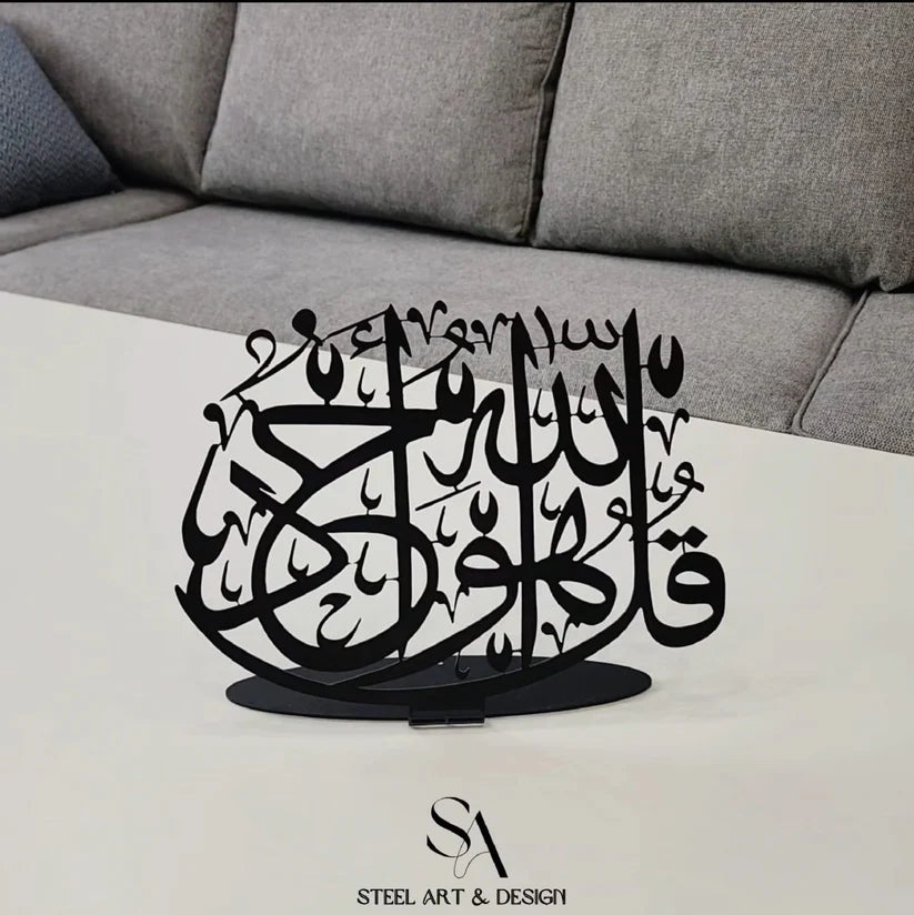 Introducing our exquisite Islamic Metal Calligraphy 3 Quls Metal Tabletop Décor, a fusion of functionality and artistic beauty. Crafted with precision and care, this 3 Quls Metal Tabletop features intricate Islamic calligraphy that adds an elegant touch to your desk.